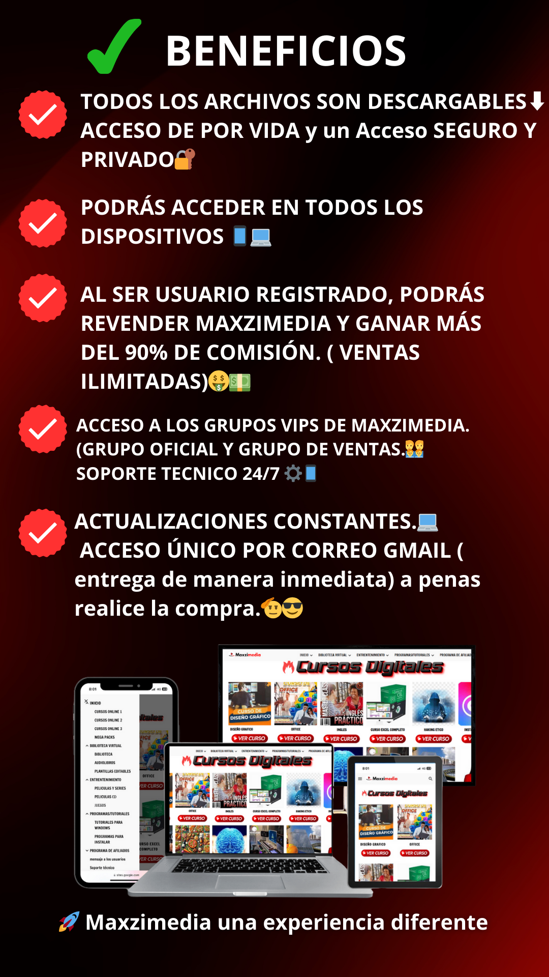 Accederás a nuestra plataforma digital cuando quiera y desee no hay mensualidades ni suscripciones ni anualidades, podrá ingresar desde cualquier dispositivo, pc, Tablet o celular, contamos con soporte técnico, actualizaciones constantes, agregaremos contenido cada semana, nuestra plataforma digital es de único acceso por su correo, 100% seguro.